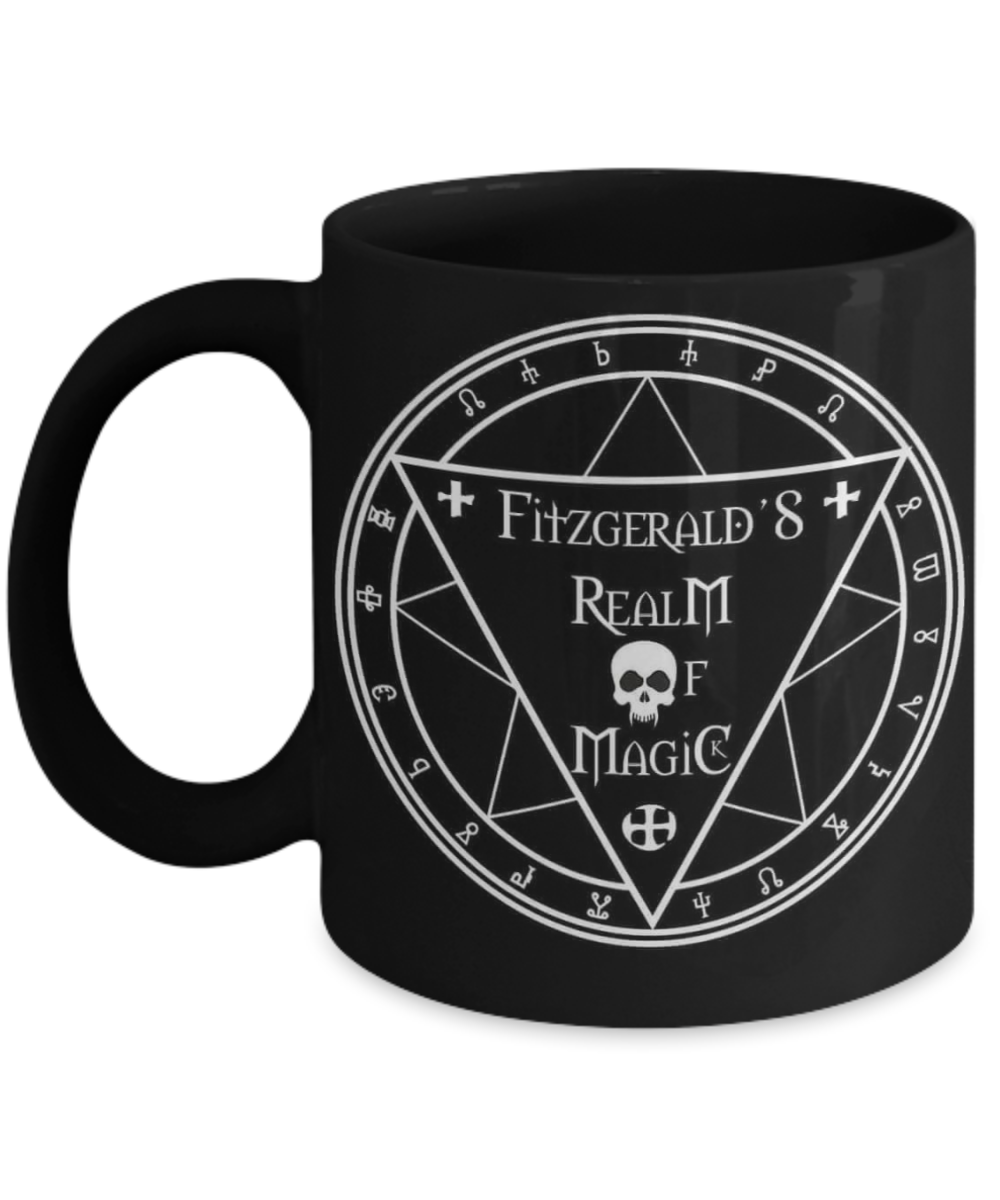 The Fitzgerald’s Realm Magic Circle Logo Mug Is perfect for a cup of your favorite wicked brew! 15 oz mug. Get yours now and you can have your coffee and your Magic both Black………spooky!